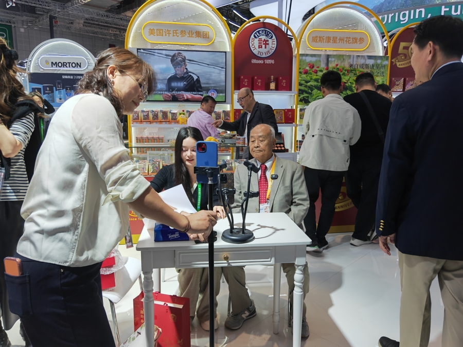 今年83岁的许忠政是美籍华人,不远万里来到上海,亲自坐镇展台。他于1974年在美国创办许氏参业集团,其花旗参产品已进入中国市场,主要在中国南部城市销售。今年受各种因素影响,公司中国市场的销售额有些下滑。进博会上,中国境内各个城市的采购商都来了,他希望借此开拓北方市场。